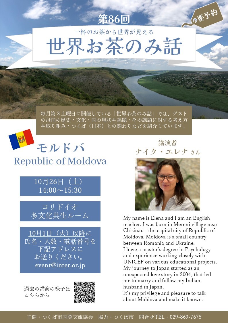2024年09月24日 イベント 第86回 世界お茶のみ話 モルドバ編 定員に達したため、現在キャンセル待ちにて受け付けております。 10月の世界お茶のみ話のご案内です。第86回 世界お茶のみ話は『モルドバ編』です。英語講師をされている、ナイク エレナさんがご講演してくださいます。ご興味のある方はぜひお越しください。 申込開始日は10月1日(火)となりますので、それ以降にお申込みいただくようお願いいたします。 チラシはこちら。期日: 10月26日(土)時間: 14:00 ~ 15:30場所: コリドイオ3階多文化共生ルーム定員: 先着30名程度申込開始日:10月1日(火)対面での開催です。 お申し込みは、ご参加される代表者の氏名、人数、電話番号をご記入のうえメールまたはお電話でお申し込みください。メール宛先:event〇inter.or.jp ←○を@に変えてください。 [トップに戻る]