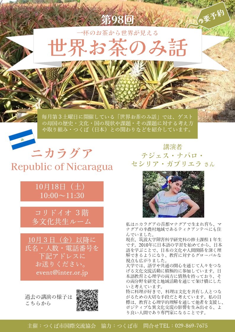 2025年09月24日 新着 第98回 世界お茶のみ話 ニカラグア編 10月の世界お茶のみ話のご案内です。第98回 世界お茶のみ話は『ニカラグア編』です。テジェス・ナバロ・セシリア・ガブリエラさんが講演してくださいます。今回は英語での講演となりますので、ボランティアの通訳を行います。ご興味のある方はぜひお越しください。 申込開始日は10月3日(金)となりますので、それ以降にお申込みいただくようお願いいたします。申込開始日より前にお申込みをされますとお受けできません。 また、当日の無断キャンセルが増加しています。キャンセル待ちの方がいらっしゃる場合がありますので、キャンセルの際はご連絡くださいますようお願いいたします。皆さまにより楽しんでいただくイベント運営のために、ご協力をお願いいたします。 チラシはこちら。期日: 10月18日(土)時間: 10:00 ~ 11:30場所: コリドイオ3階多文化共生ルーム定員: 先着30名程度申込開始日:10月3日(金)言語:英語(通訳有) お申し込みは、ご参加される代表者の氏名、人数、電話番号をご記入のうえメールまたはお電話でお申し込みください。メール宛先:event〇inter.or.jp ←○を@に変えてください。 [トップに戻る]