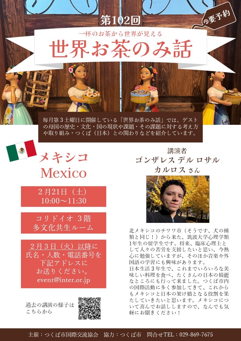 2026年01月19日 新着 第102回 世界お茶のみ話 メキシコ編 2月の世界お茶のみ話のご案内です。第102回 世界お茶のみ話は『メキシコ編』です。当協会のイベント「シティチャットカフェ」でもご協力いただいている、ゴンザレス デル ロサル カルロスさんが講演してくださいます。ご興味のある方はぜひお越しください。 申込開始日は2月3日(火)となりますので、それ以降にお申込みいただくようお願いいたします。申込開始日より前にお申込みをされますとお受けできません。 また、当日の無断キャンセルが増加しています。キャンセル待ちの方がいらっしゃる場合がありますので、キャンセルの際はご連絡くださいますようお願いいたします。皆さまにより楽しんでいただくイベント運営のために、ご協力をお願いいたします。 チラシはこちら。期日: 2月21日(土)時間: 10:00 ~ 11:30場所: コリドイオ3階多文化共生ルーム定員: 先着30名程度申込開始日:2月3日(火) お申し込みは、ご参加される代表者の氏名、人数、電話番号をご記入のうえメールまたはお電話でお申し込みください。メール宛先:event〇inter.or.jp ←○を@に変えてください。 [トップに戻る]