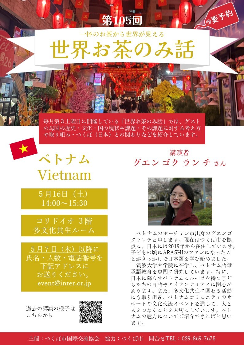 2026年04月17日 新着 第105回 世界お茶のみ話 ベトナム編 5月の世界お茶のみ話のご案内です。第105回 世界お茶のみ話は『ベトナム編』です。当協会の多文化共生コーディネーターである、グエン ゴク ラン チさんが講演してくださいます。ご興味のある方はぜひお越しください。 なお、今回は5月16・17日に開催する『つくばフェスティバル』と同時開催となるため、イベントの時間が通常と異なっておりますのでご注意ください。 申込開始日は5月7日(木)となりますので、それ以降にお申込みいただくようお願いいたします。申込開始日より前にお申込みをされますとお受けできません。 また、当日の無断キャンセルが増加しています。キャンセル待ちの方がいらっしゃる場合がありますので、キャンセルの際はご連絡くださいますようお願いいたします。皆さまにより楽しんでいただくイベント運営のために、ご協力をお願いいたします。 チラシはこちら。期日: 5月16日(土)時間: 14:00 ~ 15:30場所: コリドイオ3階多文化共生ルーム定員: 先着30名程度言語:日本語申込開始日:5月7日(木) お申し込みは、ご参加される代表者の氏名、人数、電話番号をご記入のうえメールまたはお電話でお申し込みください。メール宛先:event〇inter.or.jp ←○を@に変えてください。 [トップに戻る]